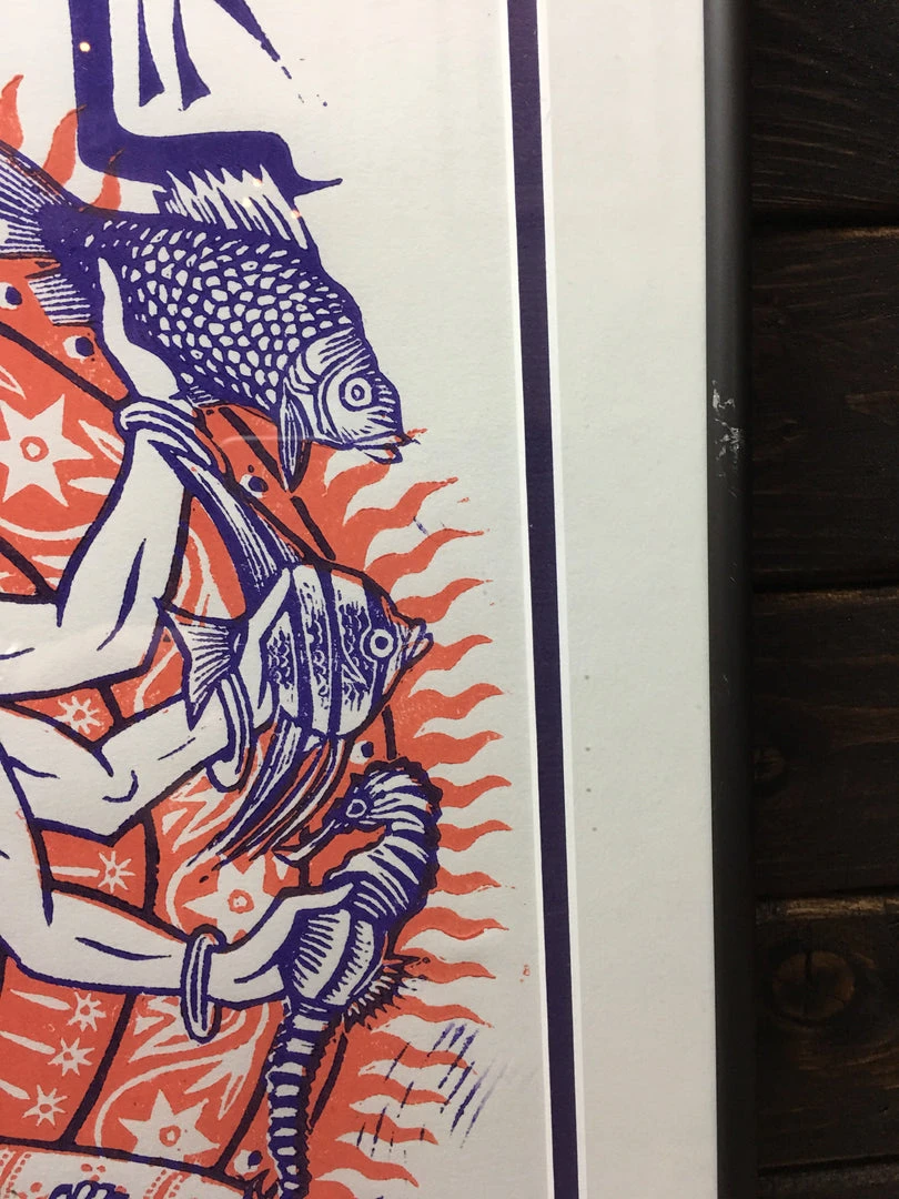 Type: Limited edition linocut poster on recycled paper, signed and numbered out of 500 printed. Ultra rare poster! Framed using archival framing materials, will ship framed.