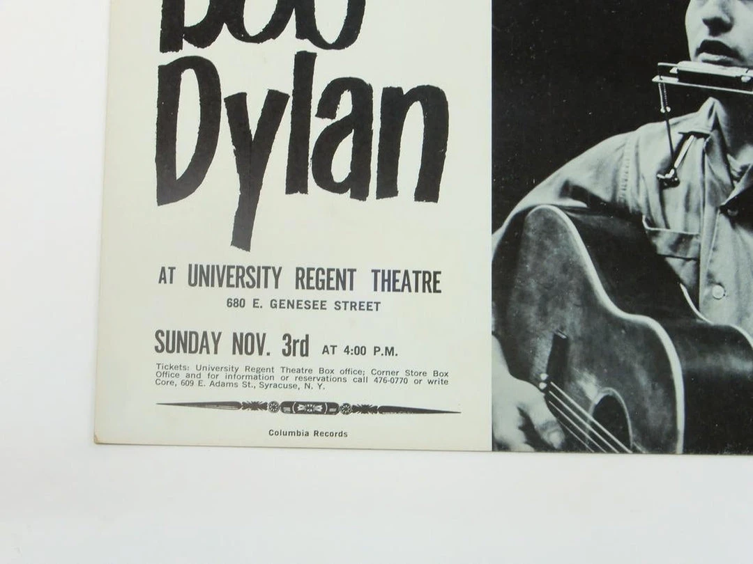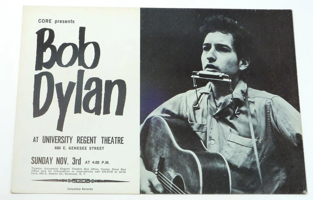 One of the most famous Bob Dylan posters of all time! This 1963 Bob Dylan poster is rarely found for sale in an original 1st printing. This poster is for the Dylan concert that took place on November 3rd, 1963 at The University Regent Theater in Syracuse, New York. Produced by CORE as noted in the top left of the poster, this ties Bob to the Civil Rights movement of the 60’s. “CORE presents” references the Congress of Racial Equality.Â